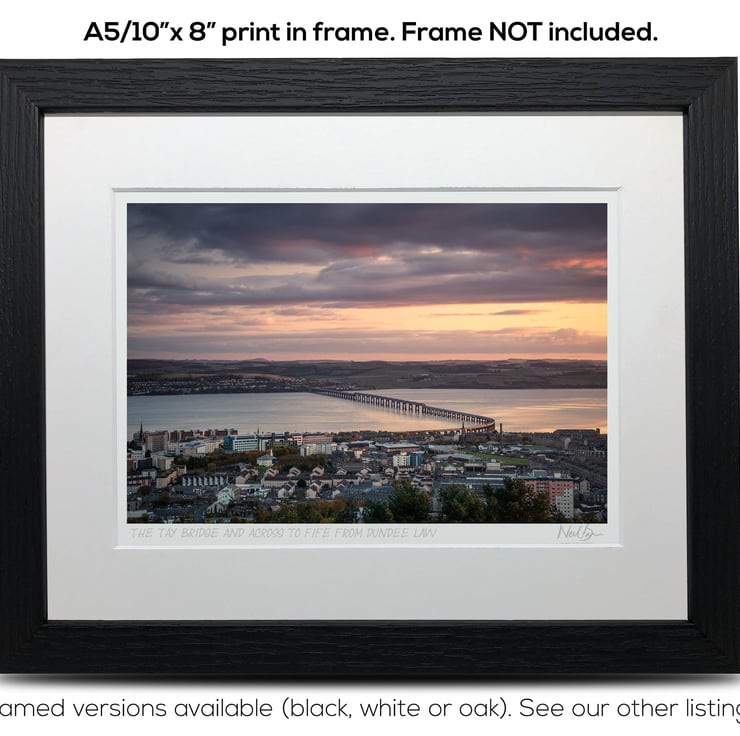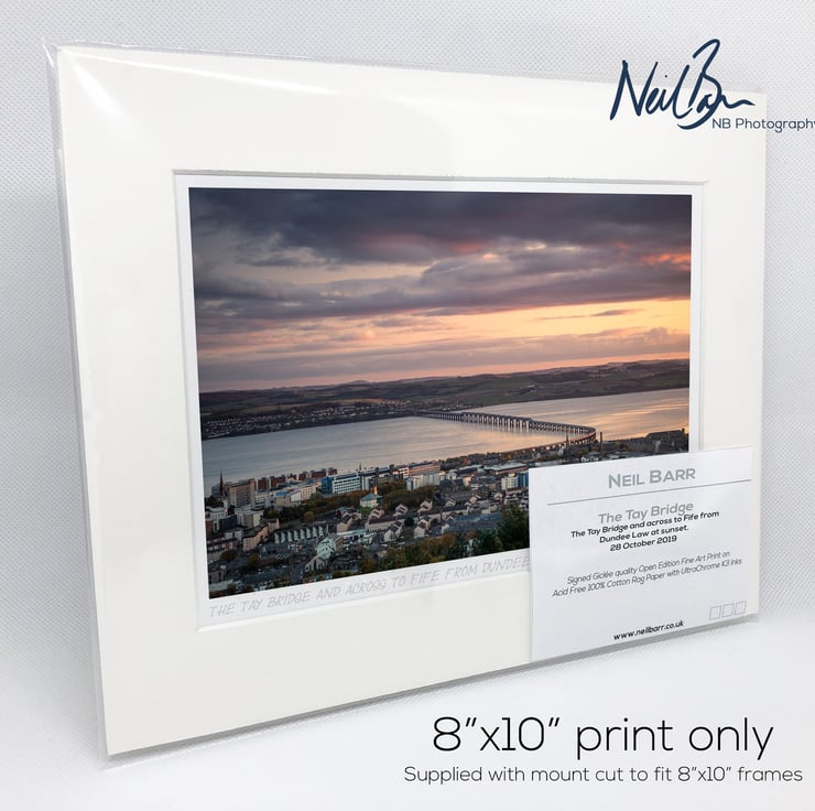 Supplied already mounted, wrapped & with signed labels & certificate, the image is printed on A5 size fine art paper (148x210mm). The actual image size is smaller (see listing images for sizes - image approx. 185x123mm) to allow for the signature & inscription. The 100% acid-free mount is cut to fit standard ready-made frames from high street stores. EXTERNAL mount size is 10"x8". This is the OUTSIDE size of the mount (and thus the size your frame should be).