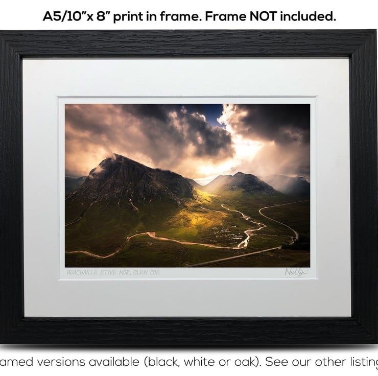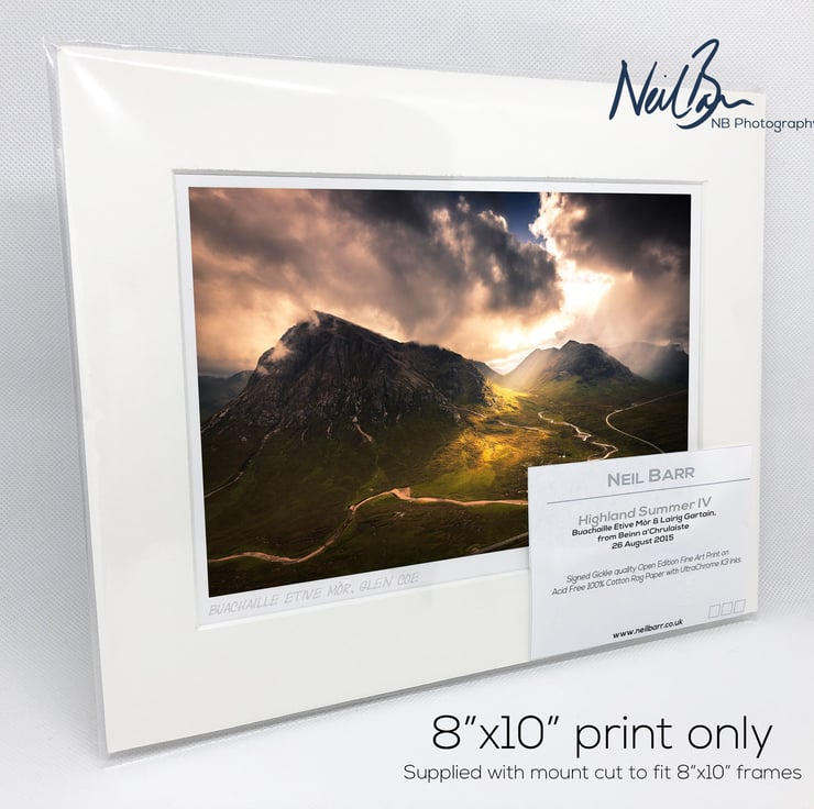 Supplied already mounted, wrapped & with signed labels & certificate, the image is printed on A5 size fine art paper (148x210mm). The actual image size is smaller (see listing images for sizes - image approx. 185x123mm) to allow for the signature & inscription. The 100% acid-free mount is cut to fit standard ready-made frames from high street stores. EXTERNAL mount size is 10"x8". This is the OUTSIDE size of the mount (and thus the size your frame should be).