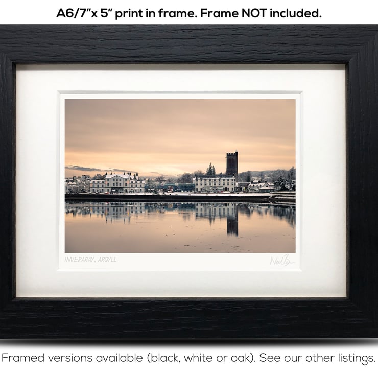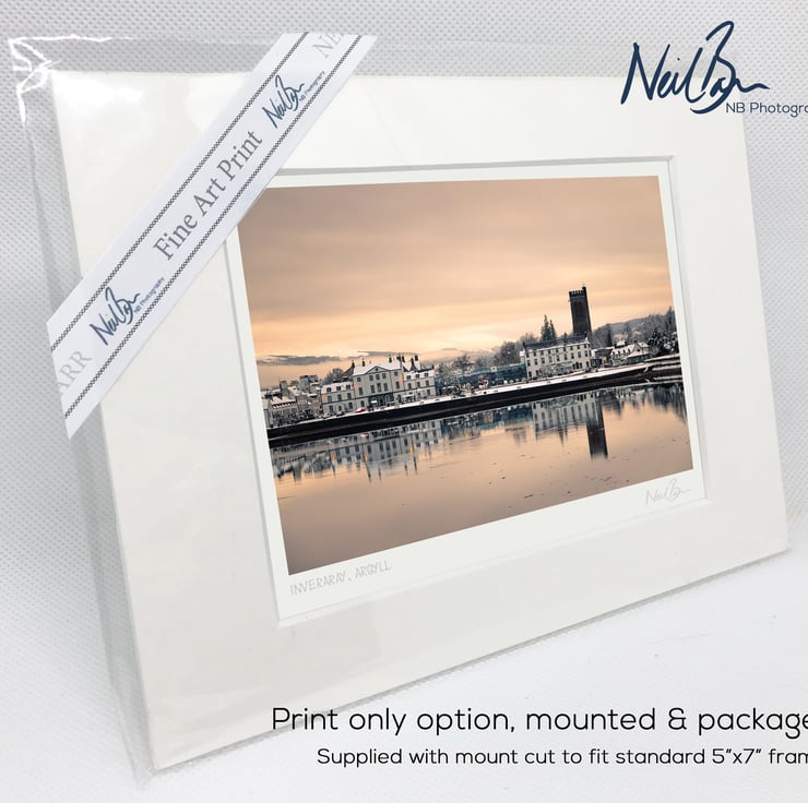 Supplied already mounted, wrapped & with signed labels & certificate, the image is printed on A6 size fine art paper (148x105mm). The actual image size is smaller (see listing images for sizes - image approx. 115x77mm) to allow for the signature & inscription. The 100% acid-free mount is cut to fit standard ready-made frames from high street stores. EXTERNAL mount size is 7"x5". This is the OUTSIDE size of the mount (and thus the size your frame should be).