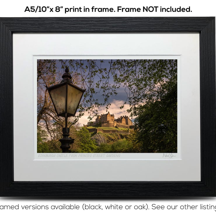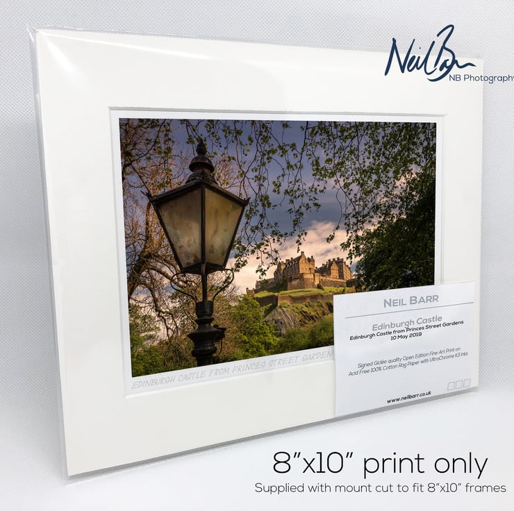 Supplied already mounted, wrapped & with signed labels & certificate, the image is printed on A5 size fine art paper (148x210mm). The actual image size is smaller (see listing images for sizes - image approx. 185x123mm) to allow for the signature & inscription. The 100% acid-free mount is cut to fit standard ready-made frames from high street stores. EXTERNAL mount size is 10"x8". This is the OUTSIDE size of the mount (and thus the size your frame should be).