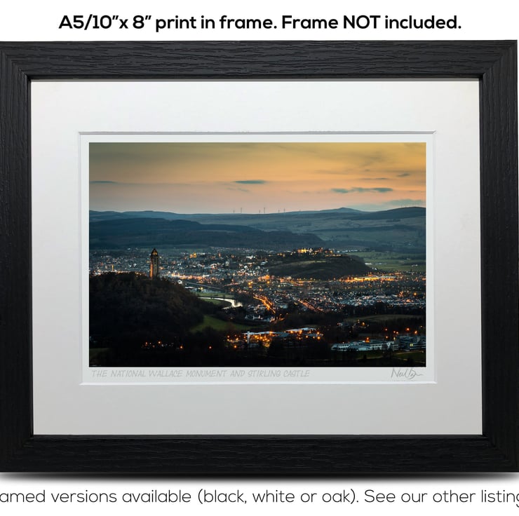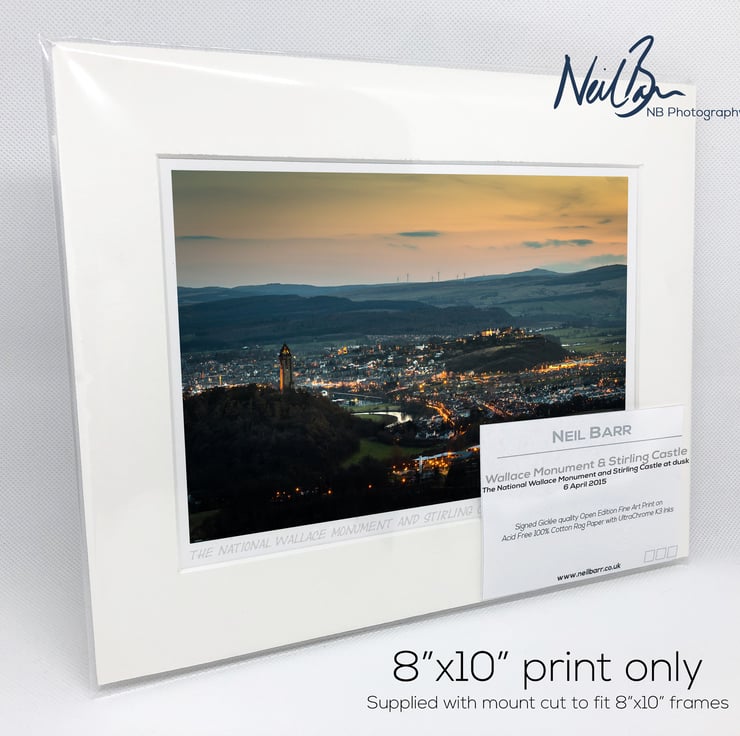 Supplied already mounted, wrapped & with signed labels & certificate, the image is printed on A5 size fine art paper (148x210mm). The actual image size is smaller (see listing images for sizes - image approx. 185x123mm) to allow for the signature & inscription. The 100% acid-free mount is cut to fit standard ready-made frames from high street stores. EXTERNAL mount size is 10"x8". This is the OUTSIDE size of the mount (and thus the size your frame should be).