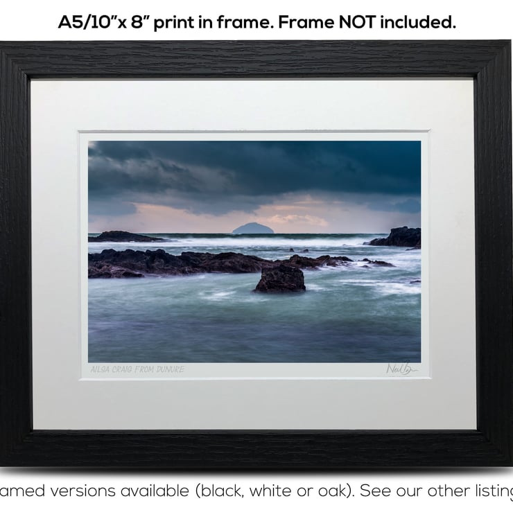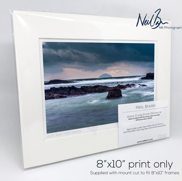 Supplied already mounted, wrapped & with signed labels & certificate, the image is printed on A5 size fine art paper (148x210mm). The actual image size is smaller (see listing images for sizes - image approx. 185x123mm) to allow for the signature & inscription. The 100% acid-free mount is cut to fit standard ready-made frames from high street stores. EXTERNAL mount size is 10"x8". This is the OUTSIDE size of the mount (and thus the size your frame should be).