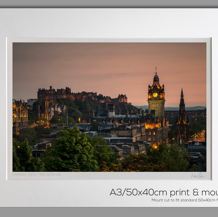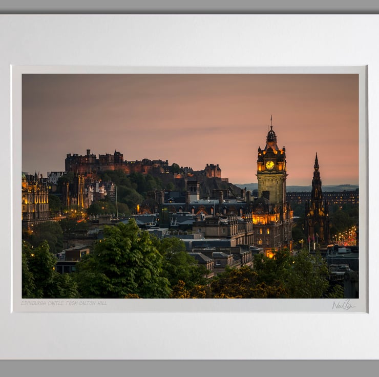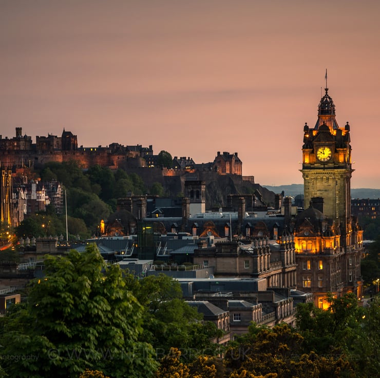 Image: "Edinburgh Castle" - Edinburgh Castle and The Balmoral Clock from Calton Hill at sunset, 18 May 2018 - by Scotland photographer Neil Barr