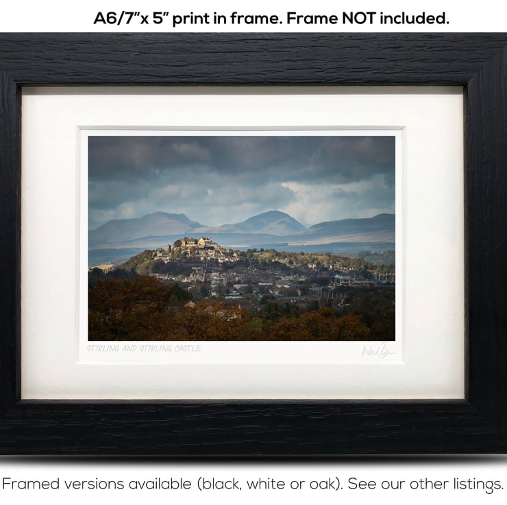 Supplied already mounted, wrapped & with signed labels & certificate, the image is printed on A6 size fine art paper (148x105mm). The actual image size is smaller (see listing images for sizes - image approx. 115x77mm) to allow for the signature & inscription. The 100% acid-free mount is cut to fit standard ready-made frames from high street stores. EXTERNAL mount size is 7"x5". This is the OUTSIDE size of the mount (and thus the size your frame should be).