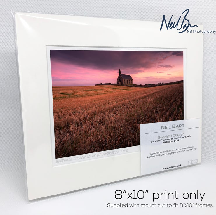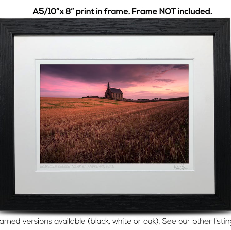 Supplied already mounted, wrapped & with signed labels & certificate, the image is printed on A5 size fine art paper (148x210mm). The actual image size is smaller (see listing images for sizes - image approx. 185x123mm) to allow for the signature & inscription. The 100% acid-free mount is cut to fit standard ready-made frames from high street stores. EXTERNAL mount size is 10"x8". This is the OUTSIDE size of the mount (and thus the size your frame should be).