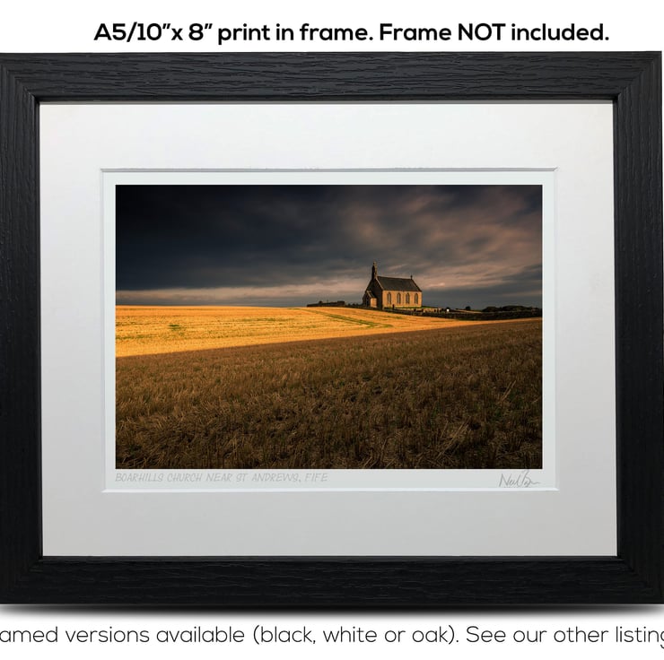 Supplied already mounted, wrapped & with signed labels & certificate, the image is printed on A5 size fine art paper (148x210mm). The actual image size is smaller (see listing images for sizes - image approx. 185x123mm) to allow for the signature & inscription. The 100% acid-free mount is cut to fit standard ready-made frames from high street stores. EXTERNAL mount size is 10"x8". This is the OUTSIDE size of the mount (and thus the size your frame should be).
