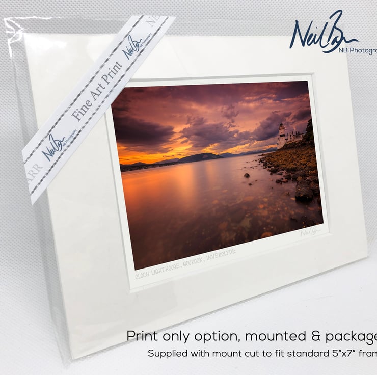 Supplied already mounted, wrapped & with signed labels & certificate, the image is printed on A6 size fine art paper (148x105mm). The actual image size is smaller (see listing images for sizes - image approx. 115x77mm) to allow for the signature & inscription. The 100% acid-free mount is cut to fit standard ready-made frames from high street stores. EXTERNAL mount size is 7"x5". This is the OUTSIDE size of the mount (and thus the size your frame should be).