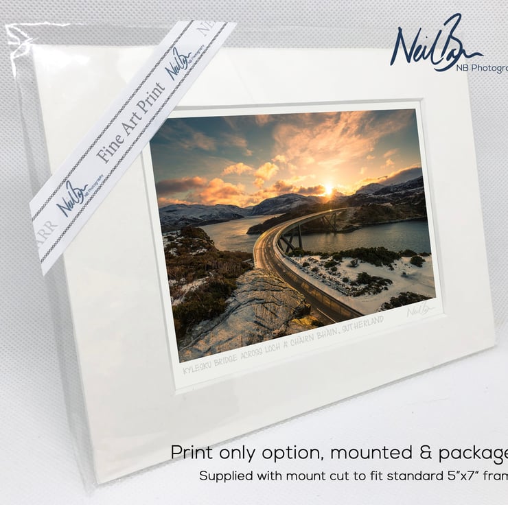 Supplied already mounted, wrapped & with signed labels & certificate, the image is printed on A6 size fine art paper (148x105mm). The actual image size is smaller (see listing images for sizes - image approx. 115x77mm) to allow for the signature & inscription. The 100% acid-free mount is cut to fit standard ready-made frames from high street stores. EXTERNAL mount size is 7"x5". This is the OUTSIDE size of the mount (and thus the size your frame should be).