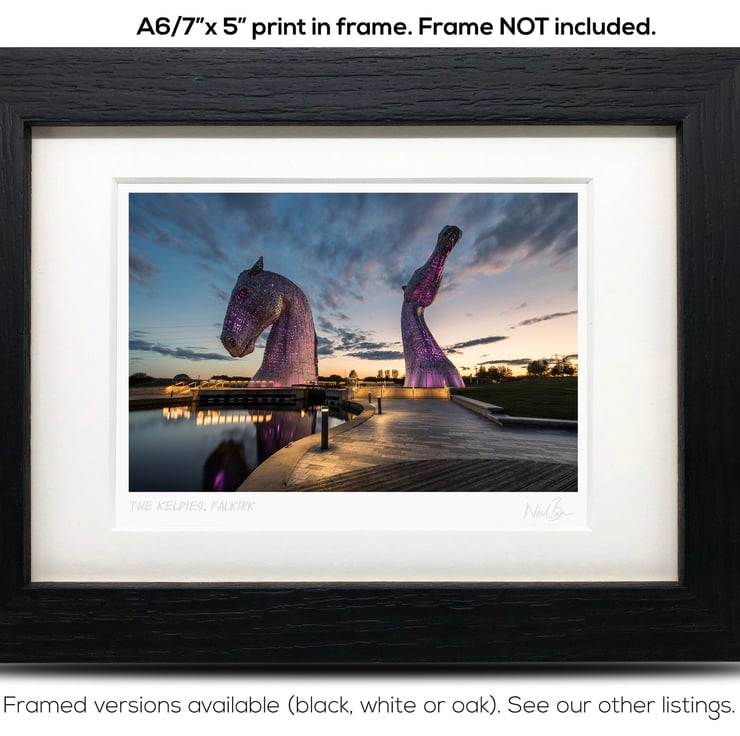 Supplied already mounted, wrapped & with signed labels & certificate, the image is printed on A6 size fine art paper (148x105mm). The actual image size is smaller (see listing images for sizes - image approx. 115x77mm) to allow for the signature & inscription. The 100% acid-free mount is cut to fit standard ready-made frames from high street stores. EXTERNAL mount size is 7"x5". This is the OUTSIDE size of the mount (and thus the size your frame should be).
