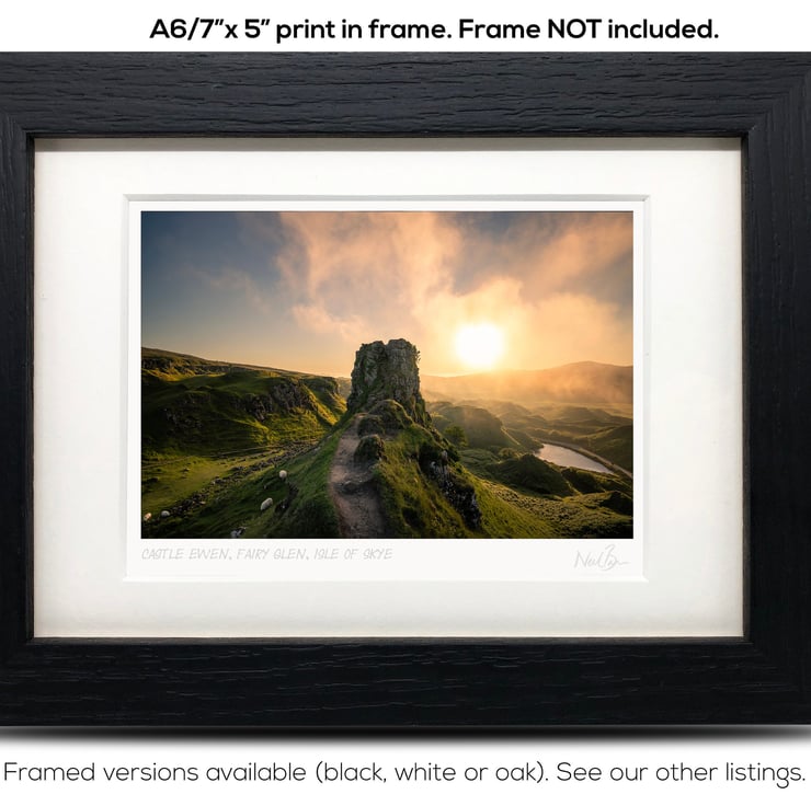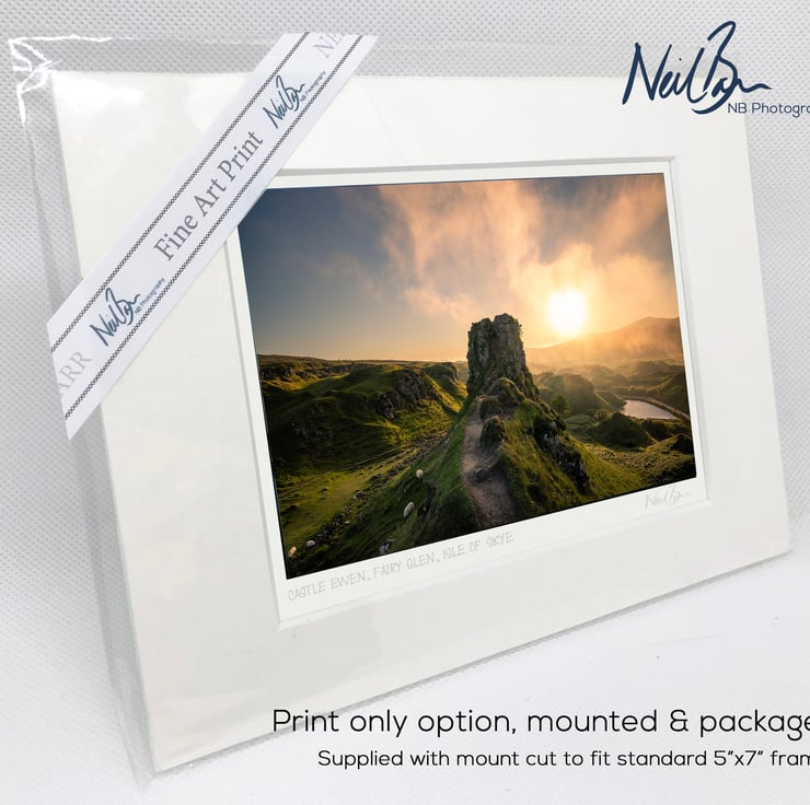 Supplied already mounted, wrapped & with signed labels & certificate, the image is printed on A6 size fine art paper (148x105mm). The actual image size is smaller (see listing images for sizes - image approx. 115x77mm) to allow for the signature & inscription. The 100% acid-free mount is cut to fit standard ready-made frames from high street stores. EXTERNAL mount size is 7"x5". This is the OUTSIDE size of the mount (and thus the size your frame should be).