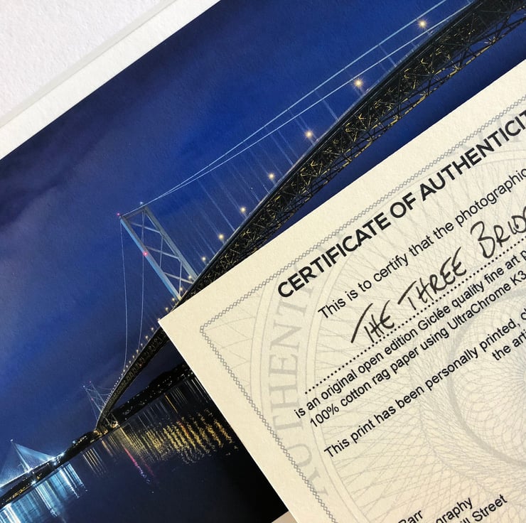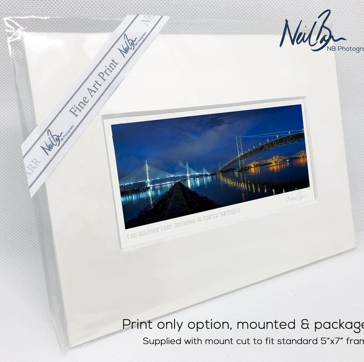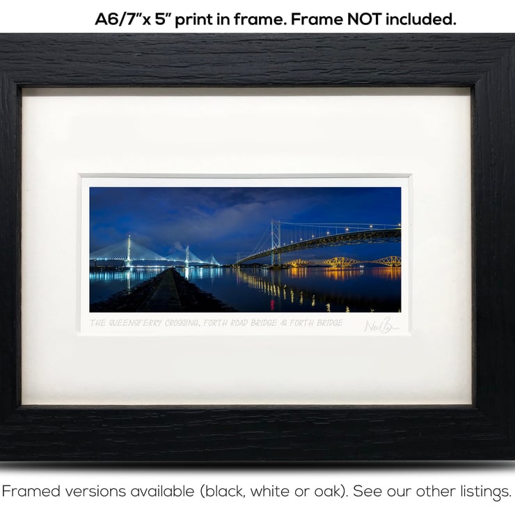 Supplied already mounted, wrapped & with signed labels & certificate, the image is printed on A6 size fine art paper (148x105mm). The actual image size is smaller (see listing images for sizes - image approx. 115x46mm) to allow for the signature & inscription. The 100% acid-free mount is cut to fit standard ready-made frames from high street stores. EXTERNAL mount size is 7"x5". This is the OUTSIDE size of the mount (and thus the size your frame should be).