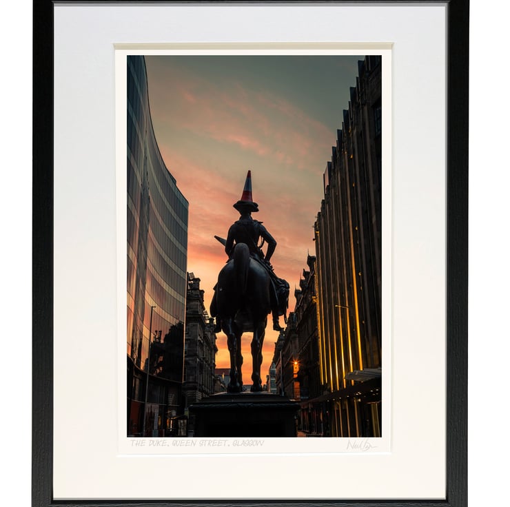 Image: "The Duke" - Duke of Wellington statue with his traffic cone hat, Queen St, Glasgow at dawn, 14 April 2018 - by photographer Neil Barr