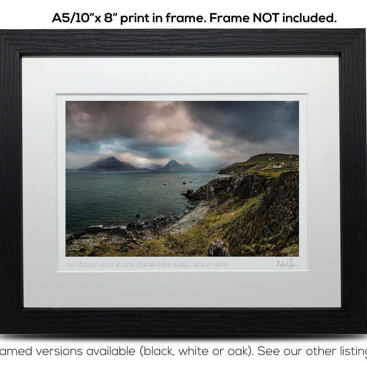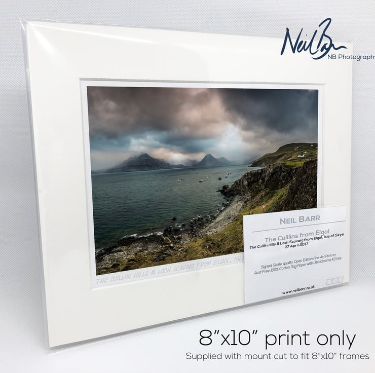 Supplied already mounted, wrapped & with signed labels & certificate, the image is printed on A5 size fine art paper (148x210mm). The actual image size is smaller (see listing images for sizes - image approx. 185x123mm) to allow for the signature & inscription. The 100% acid-free mount is cut to fit standard ready-made frames from high street stores. EXTERNAL mount size is 10"x8". This is the OUTSIDE size of the mount (and thus the size your frame should be).