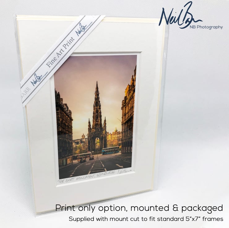 Supplied already mounted, wrapped & with signed labels & certificate, the image is printed on A6 size fine art paper (148x105mm). The actual image size is smaller (see listing images for sizes - image approx. 115x77mm) to allow for the signature & inscription. The 100% acid-free mount is cut to fit standard ready-made frames from high street stores. EXTERNAL mount size is 7"x5". This is the OUTSIDE size of the mount (and thus the size your frame should be).