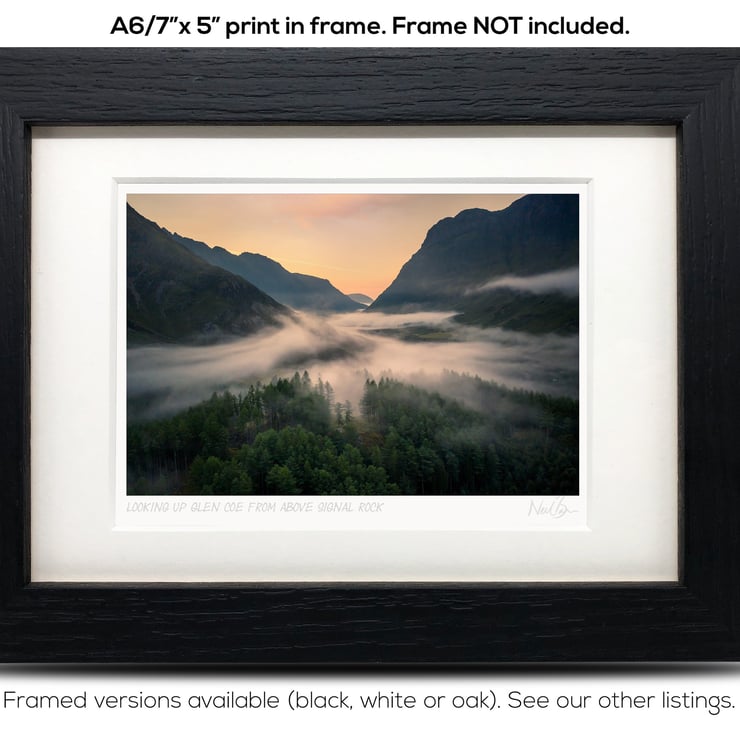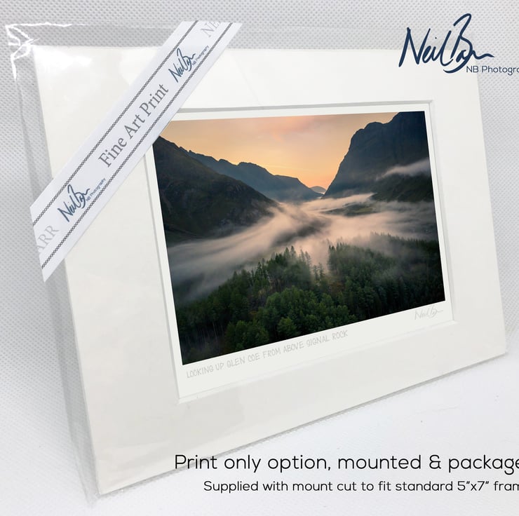 Supplied already mounted, wrapped & with signed labels & certificate, the image is printed on A6 size fine art paper (148x105mm). The actual image size is smaller (see listing images for sizes - image approx. 115x77mm) to allow for the signature & inscription. The 100% acid-free mount is cut to fit standard ready-made frames from high street stores. EXTERNAL mount size is 7"x5". This is the OUTSIDE size of the mount (and thus the size your frame should be).