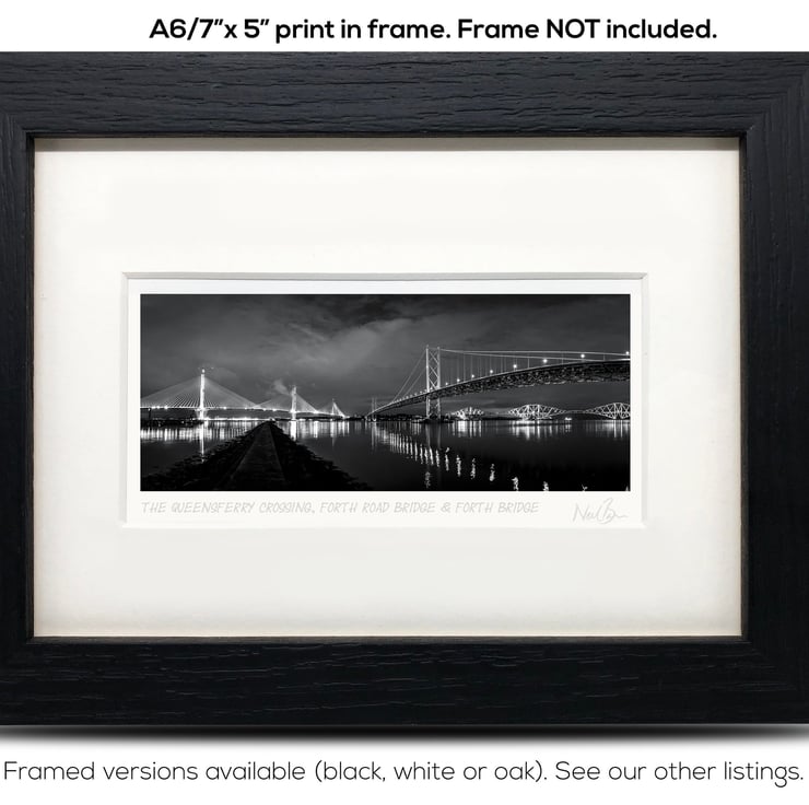 Supplied already mounted, wrapped & with signed labels & certificate, the image is printed on A6 size fine art paper (148x105mm). The actual image size is smaller (see listing images for sizes - image approx. 115x46mm) to allow for the signature & inscription. The 100% acid-free mount is cut to fit standard ready-made frames from high street stores. EXTERNAL mount size is 7"x5". This is the OUTSIDE size of the mount (and thus the size your frame should be).
