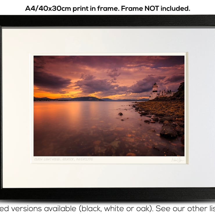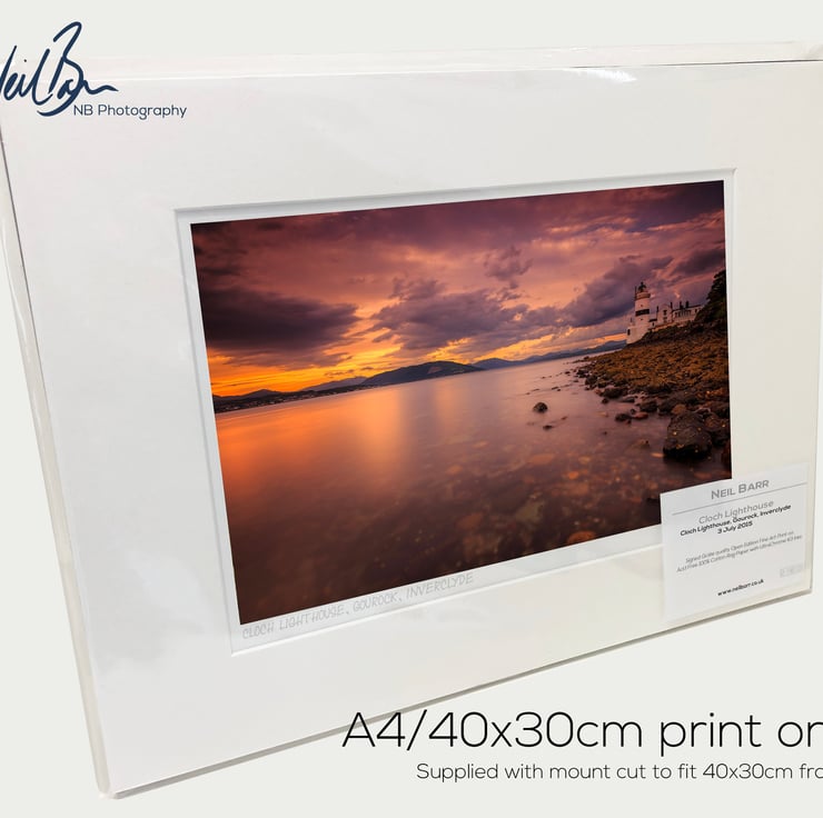 Supplied already mounted, wrapped & with signed labels & certificate, the image is printed on A4 size fine art paper (210x297mm). The actual image size is smaller (see listing images for sizes - image approx. 268x179mm) to allow for the signature & inscription. The 100% acid-free mount is cut to fit standard ready-made frames from high street stores. EXTERNAL mount size is 40cm x 30cm. This is the OUTSIDE size of the mount (and thus the size your frame should be).