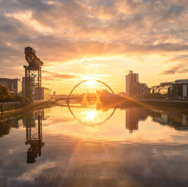 Image: "Double Dawn" - The morning sun rising over the River Clyde and the Clyde Arc, Glasgow., 21 October 2019 - by Scotland photographer Neil Barr