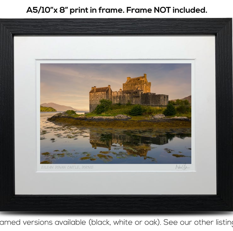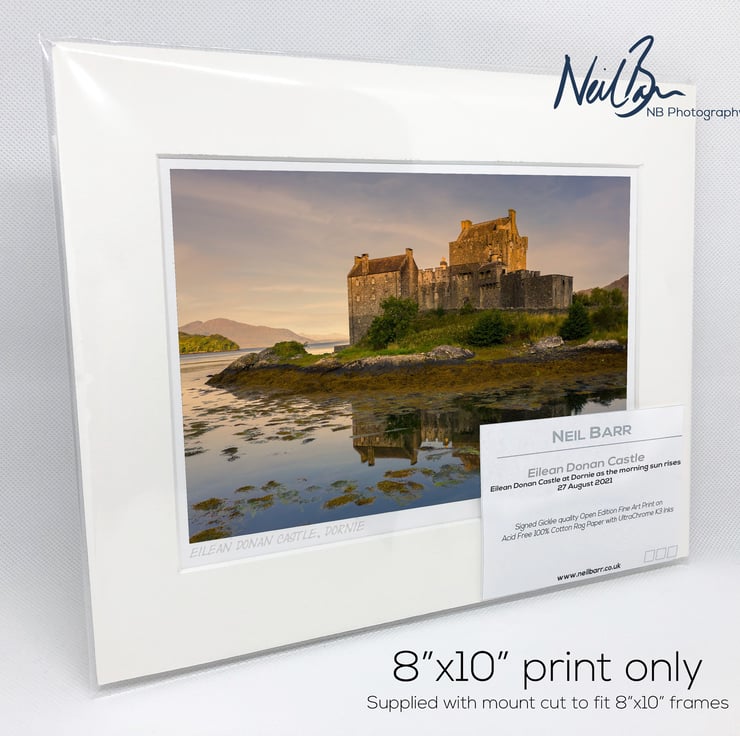 Supplied already mounted, wrapped & with signed labels & certificate, the image is printed on A5 size fine art paper (148x210mm). The actual image size is smaller (see listing images for sizes - image approx. 185x123mm) to allow for the signature & inscription. The 100% acid-free mount is cut to fit standard ready-made frames from high street stores. EXTERNAL mount size is 10"x8". This is the OUTSIDE size of the mount (and thus the size your frame should be).