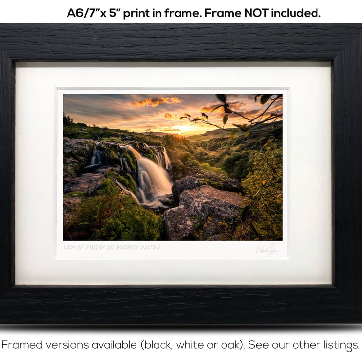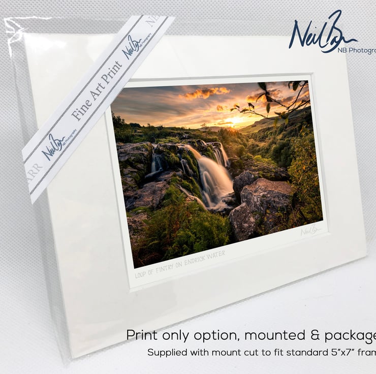 Supplied already mounted, wrapped & with signed labels & certificate, the image is printed on A6 size fine art paper (148x105mm). The actual image size is smaller (see listing images for sizes - image approx. 115x77mm) to allow for the signature & inscription. The 100% acid-free mount is cut to fit standard ready-made frames from high street stores. EXTERNAL mount size is 7"x5". This is the OUTSIDE size of the mount (and thus the size your frame should be).