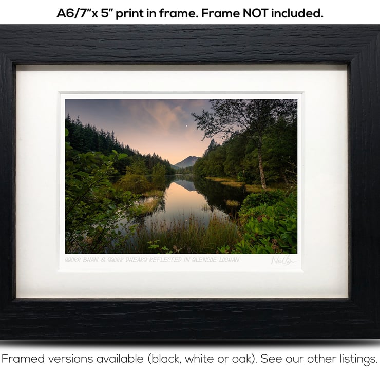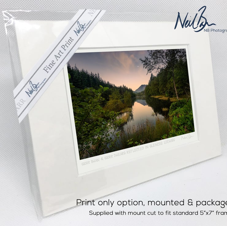 Supplied already mounted, wrapped & with signed labels & certificate, the image is printed on A6 size fine art paper (148x105mm). The actual image size is smaller (see listing images for sizes - image approx. 115x77mm) to allow for the signature & inscription. The 100% acid-free mount is cut to fit standard ready-made frames from high street stores. EXTERNAL mount size is 7"x5". This is the OUTSIDE size of the mount (and thus the size your frame should be).