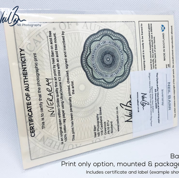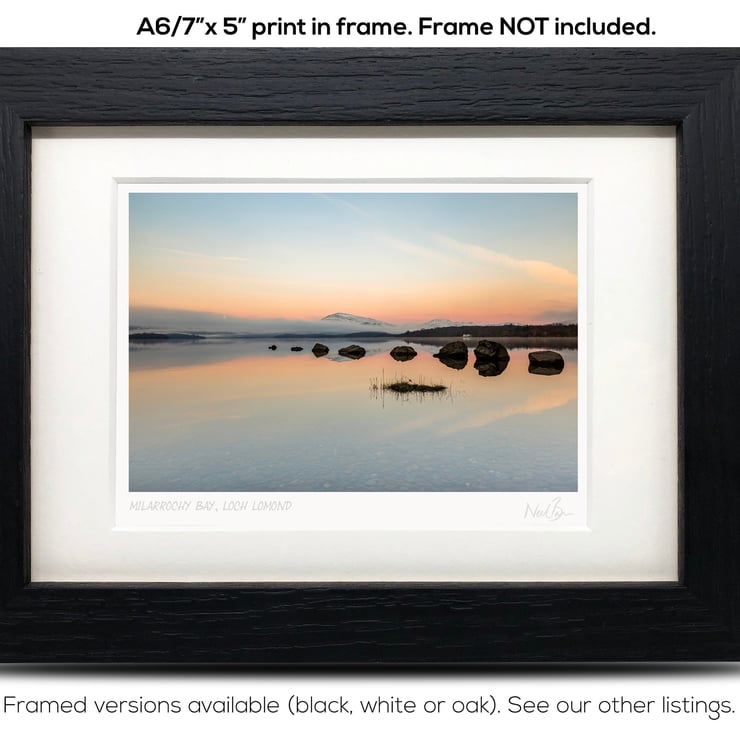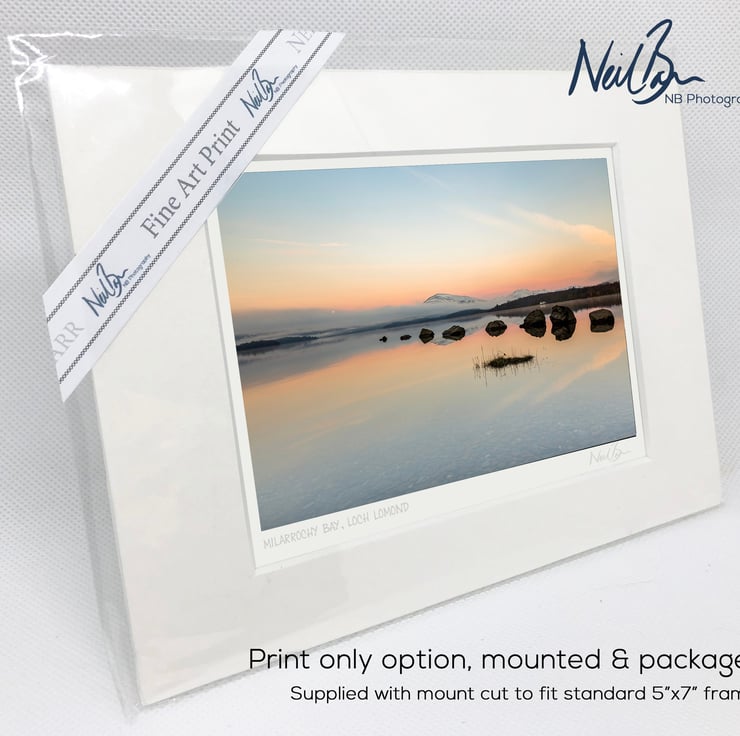 Supplied already mounted, wrapped & with signed labels & certificate, the image is printed on A6 size fine art paper (148x105mm). The actual image size is smaller (see listing images for sizes - image approx. 115x77mm) to allow for the signature & inscription. The 100% acid-free mount is cut to fit standard ready-made frames from high street stores. EXTERNAL mount size is 7"x5". This is the OUTSIDE size of the mount (and thus the size your frame should be).