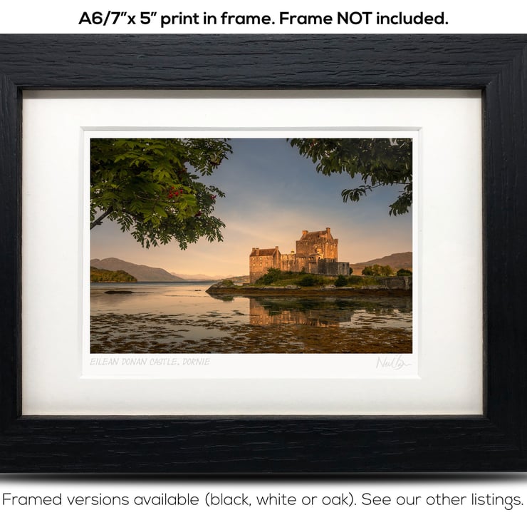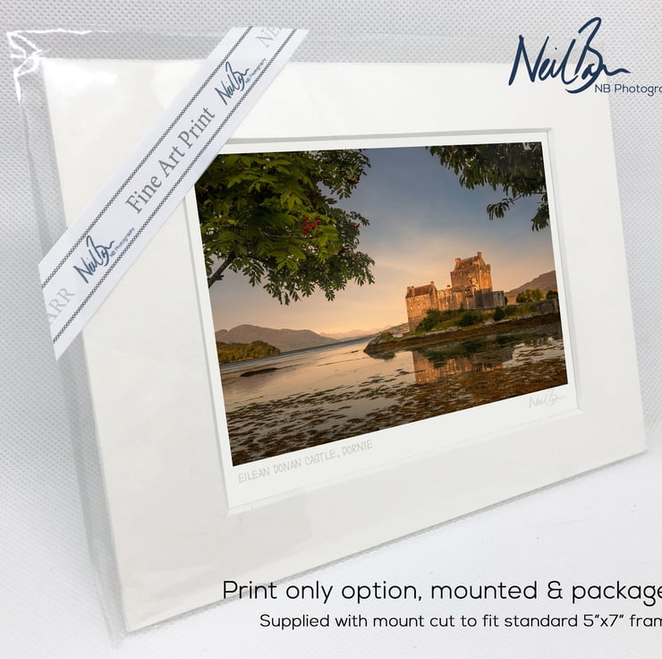 Supplied already mounted, wrapped & with signed labels & certificate, the image is printed on A6 size fine art paper (148x105mm). The actual image size is smaller (see listing images for sizes - image approx. 115x77mm) to allow for the signature & inscription. The 100% acid-free mount is cut to fit standard ready-made frames from high street stores. EXTERNAL mount size is 7"x5". This is the OUTSIDE size of the mount (and thus the size your frame should be).
