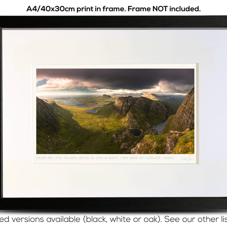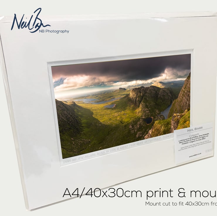 Supplied already mounted, wrapped & with signed labels & certificate, the image is printed on A4 size fine art paper (210x297mm). The actual image size is smaller (see listing images for sizes - image approx. 268x146mm) to allow for the signature & inscription. The 100% acid-free mount is cut to fit standard ready-made frames from high street stores. EXTERNAL mount size is 40cm x 30cm. This is the OUTSIDE size of the mount (and thus the size your frame should be).