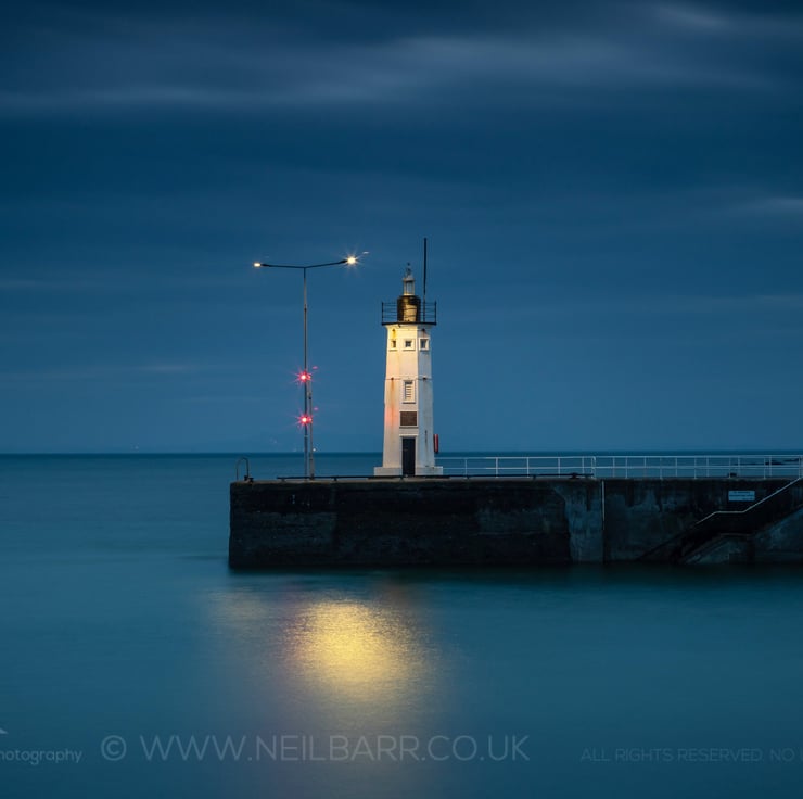 Image: "Leave A Light On" - Chalmers Lighthouse on the West Breakwater of Anstruther Easter Harbour, in the East Neuk of Fife at dusk, 29 March 2019 - by Scotland photographer Neil Barr