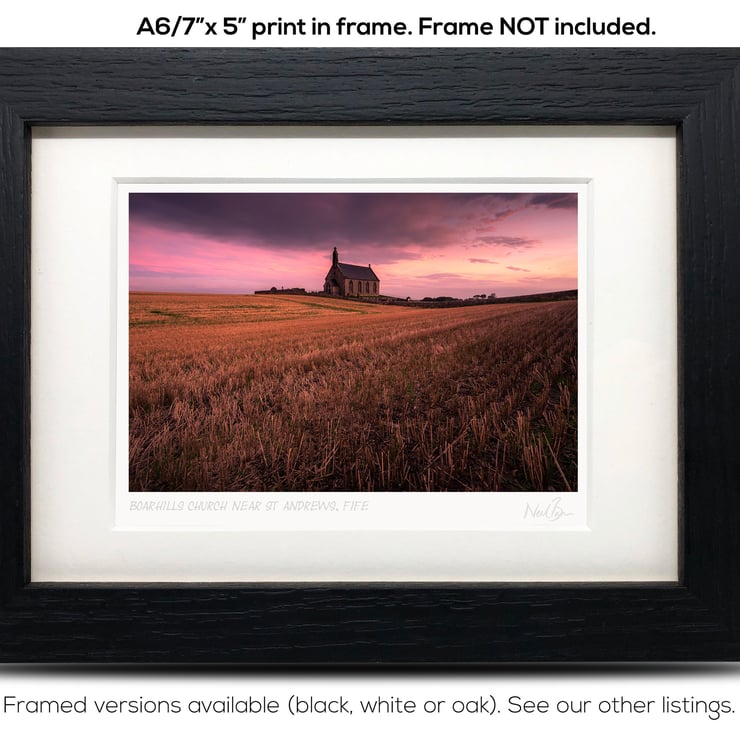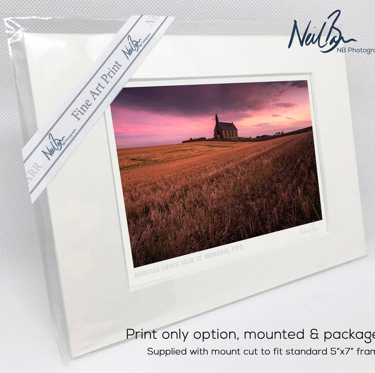 Supplied already mounted, wrapped & with signed labels & certificate, the image is printed on A6 size fine art paper (148x105mm). The actual image size is smaller (see listing images for sizes - image approx. 115x77mm) to allow for the signature & inscription. The 100% acid-free mount is cut to fit standard ready-made frames from high street stores. EXTERNAL mount size is 7"x5". This is the OUTSIDE size of the mount (and thus the size your frame should be).