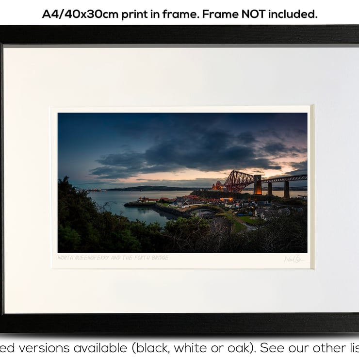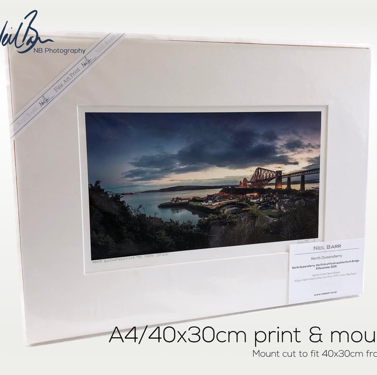 Supplied already mounted, wrapped & with signed labels & certificate, the image is printed on A4 size fine art paper (210x297mm). The actual image size is smaller (see listing images for sizes - image approx. 268x152mm) to allow for the signature & inscription. The 100% acid-free mount is cut to fit standard ready-made frames from high street stores. EXTERNAL mount size is 40cm x 30cm. This is the OUTSIDE size of the mount (and thus the size your frame should be).