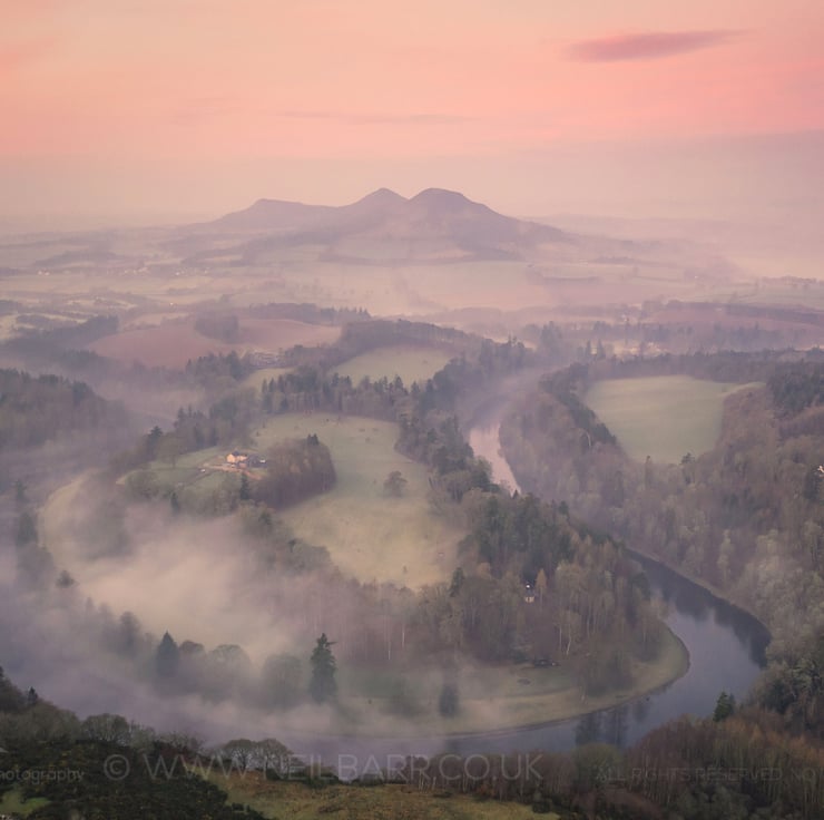 Image: "Scott's View" - The famous Scott's View with the Eildon Hills, the River Tweed and the Leaderfoot Viaduct in the Scottish Borders at dawn, 25 February 2019 - by Scotland photographer Neil Barr