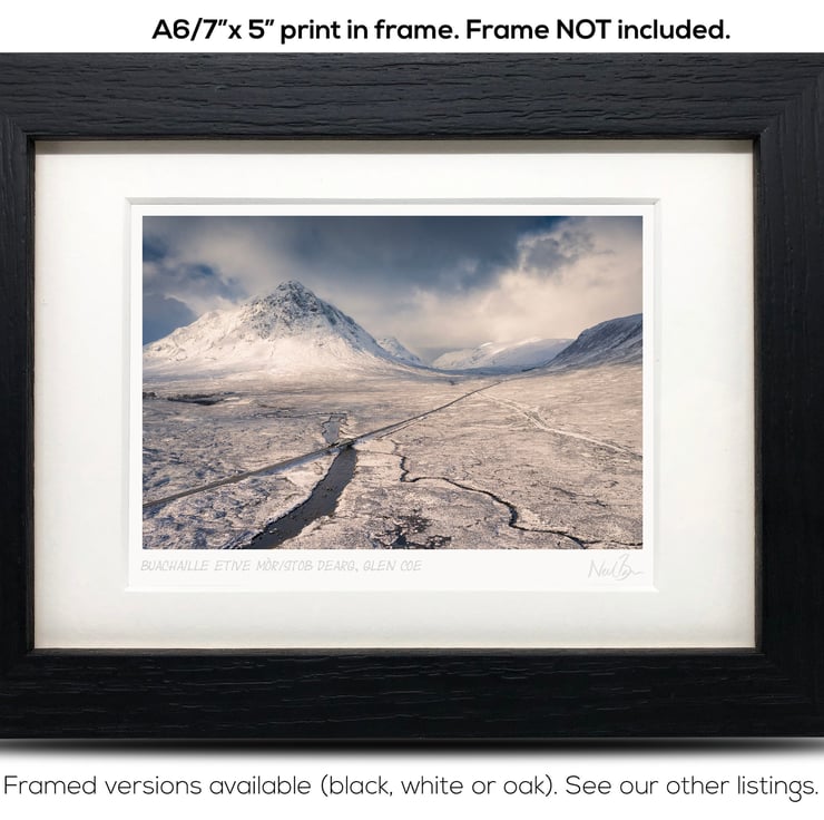 Supplied already mounted, wrapped & with signed labels & certificate, the image is printed on A6 size fine art paper (148x105mm). The actual image size is smaller (see listing images for sizes - image approx. 115x77mm) to allow for the signature & inscription. The 100% acid-free mount is cut to fit standard ready-made frames from high street stores. EXTERNAL mount size is 7"x5". This is the OUTSIDE size of the mount (and thus the size your frame should be).