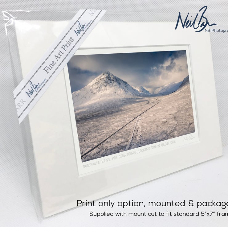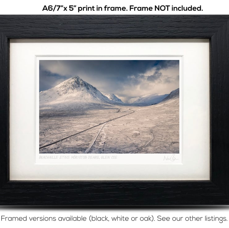 Supplied already mounted, wrapped & with signed labels & certificate, the image is printed on A6 size fine art paper (148x105mm). The actual image size is smaller (see listing images for sizes - image approx. 115x77mm) to allow for the signature & inscription. The 100% acid-free mount is cut to fit standard ready-made frames from high street stores. EXTERNAL mount size is 7"x5". This is the OUTSIDE size of the mount (and thus the size your frame should be).