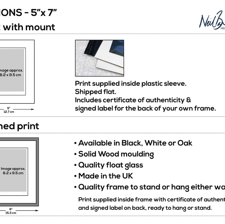Supplied already mounted, wrapped & with signed labels & certificate, the image is printed on A6 size fine art paper (148x105mm). The actual image size is smaller (see listing images for sizes - image approx. 95x82mm) to allow for the signature & inscription. The 100% acid-free mount is cut to fit standard ready-made frames from high street stores. EXTERNAL mount size is 7"x5". This is the OUTSIDE size of the mount (and thus the size your frame should be).