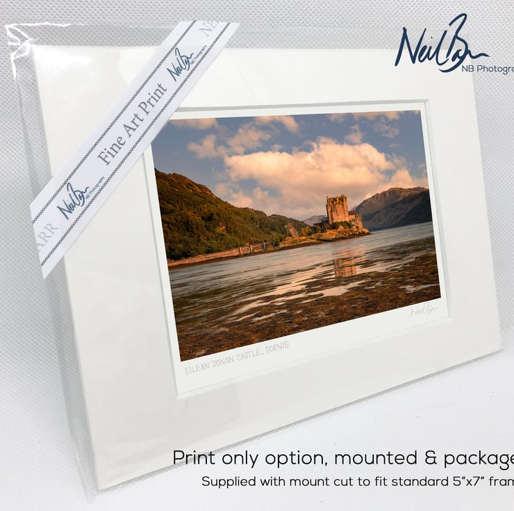 Image: "Eilean Donan Castle" - Eilean Donan Castle and Loch Alsh from Ardelve Point as the sun sets, 26 August 2021 Open edition Giclee photographic print on 100% cotton rag smooth matt fine art paper with UltraChrome K3 Inks. The smooth surface & soft velvet feel give the print an almost painterly quality. As the paper does not use any optical brighteners, the image is guaranteed to be lightfast for 100yrs in normal viewing conditions.