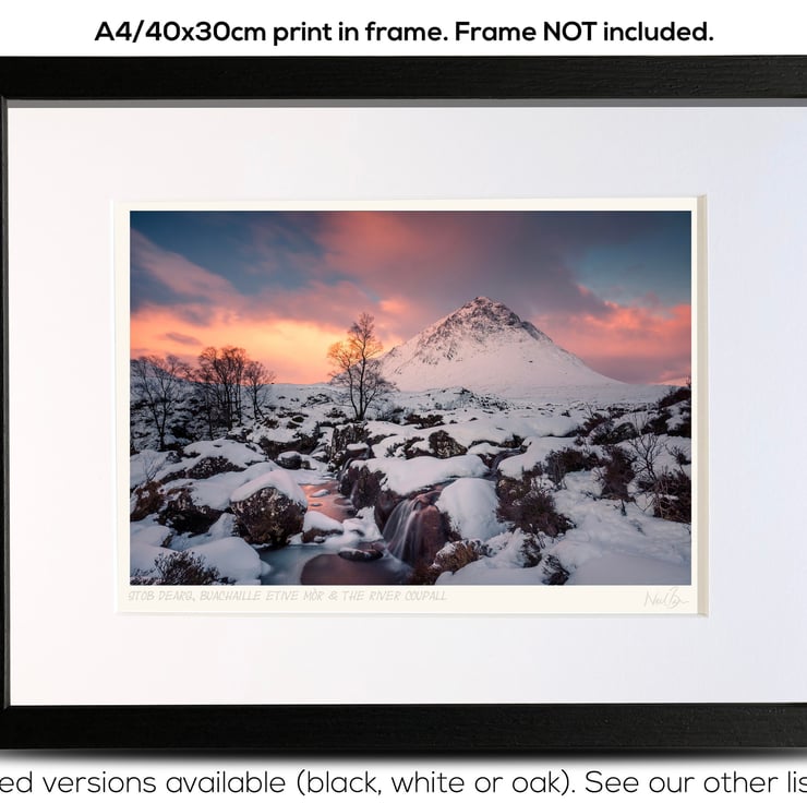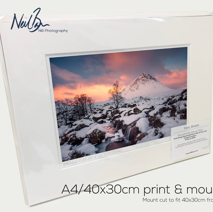 Supplied already mounted, wrapped & with signed labels & certificate, the image is printed on A4 size fine art paper (210x297mm). The actual image size is smaller (see listing images for sizes - image approx. 268x179mm) to allow for the signature & inscription. The 100% acid-free mount is cut to fit standard ready-made frames from high street stores. EXTERNAL mount size is 40cm x 30cm. This is the OUTSIDE size of the mount (and thus the size your frame should be).