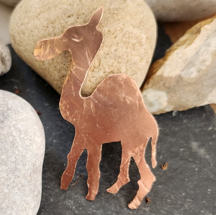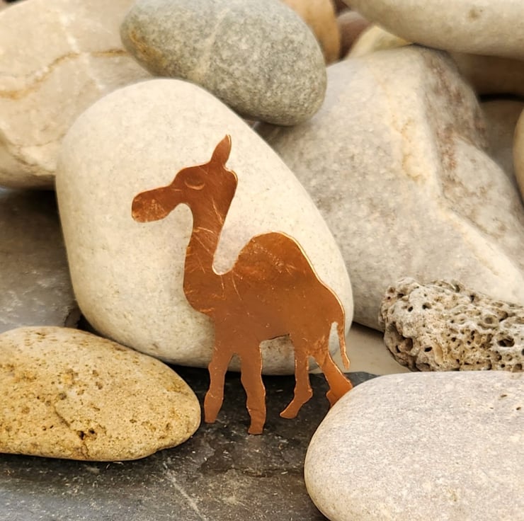 Copper sheet, textured and cut in the shape of a dromedary camel. Approximately 6cms tall.Sterling silver brooch fastener.