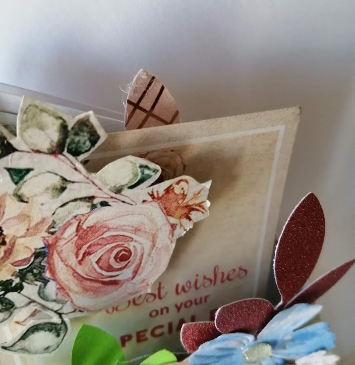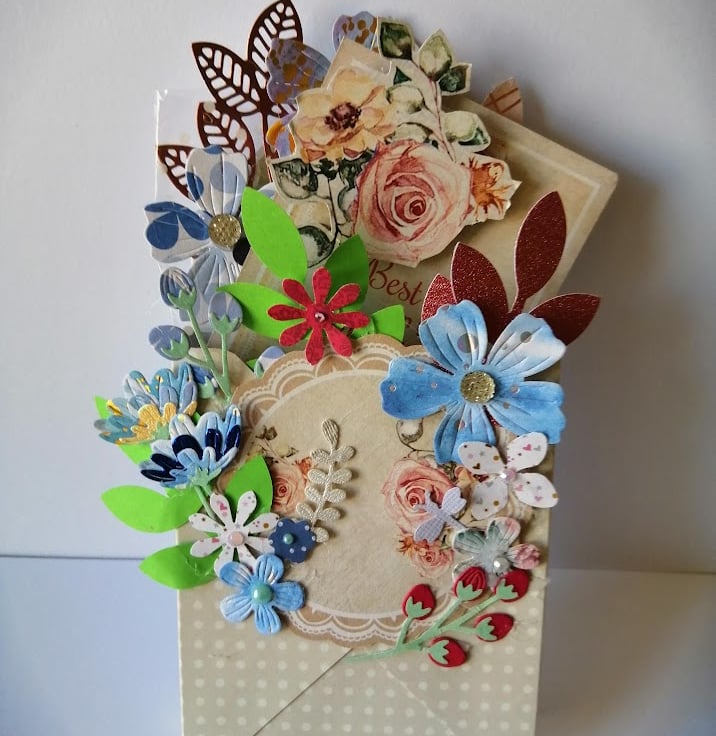 Flowers envelope box card measures 3 3/4" x 8". Decorated with beautiful handmade flowers with gems Inside box is a card that reads Best Wishes on your special day' . Backed on card base , which is same shape. Item will be packaged in brown gift box.