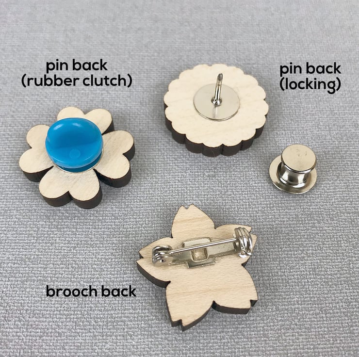Choose from either a standard brooch back or a pin back (similar to enamel pins). Pin backs can include either a rubber clutch or a metal secure locking back (for wearing outdoors). Check the photos to see all options.