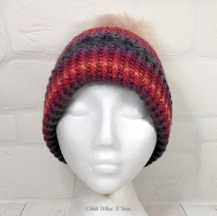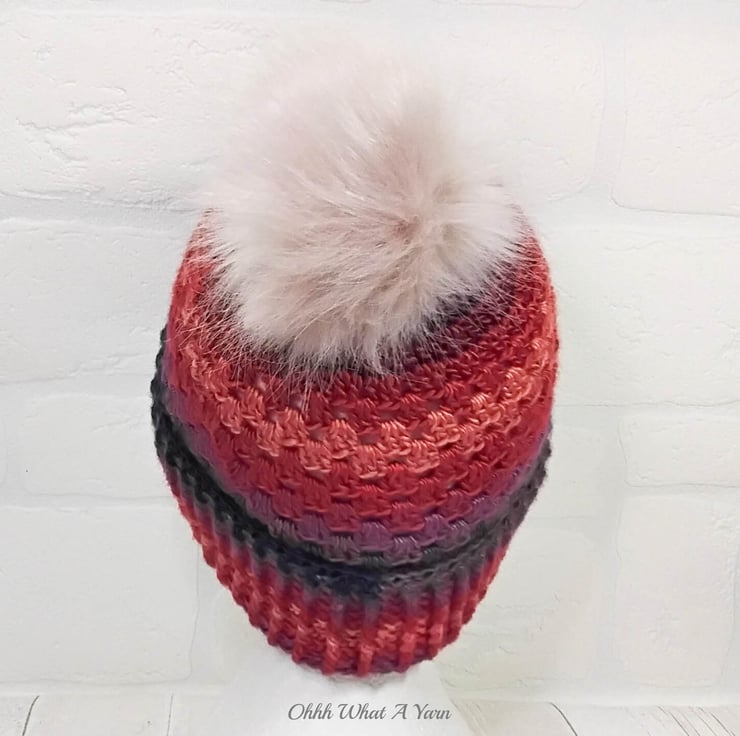 I have added a faux fur pompom. There is a button on the inside of the hat so you can easily remove the pompom by unhooking the loop around the button if you prefer your hat fluffless and for washing purposes.