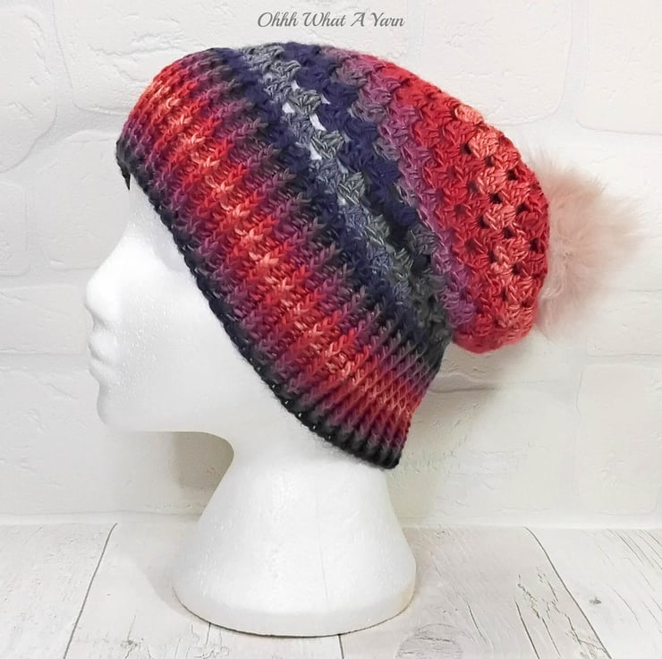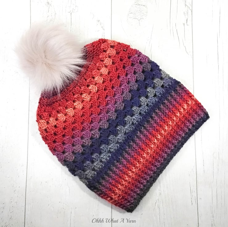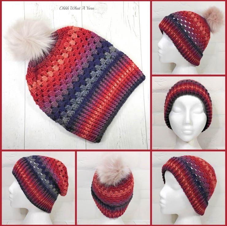 The hat body is crocheted in the fabulous and on trend granny stitch in gorgeous multi colours and I have added a deep rib border which can be turned up for a classic pompom beanie style or left unturned which allows the hat to be worn as a classic slouch hat.