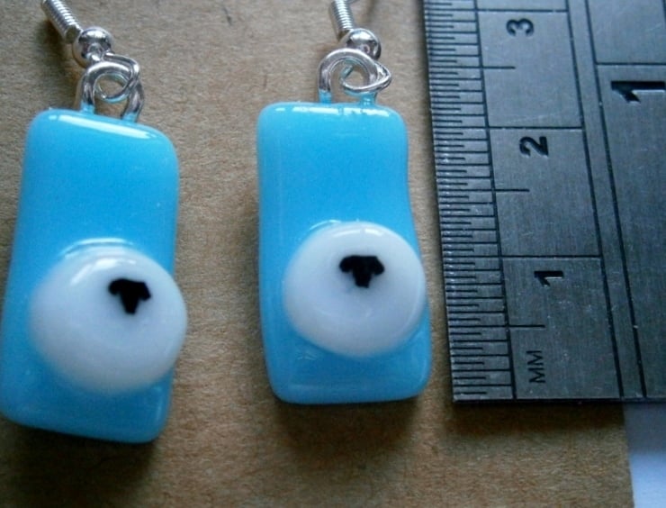 A pair of hand made fused glass Sheepy earrings in pale blue glass with white sheep.