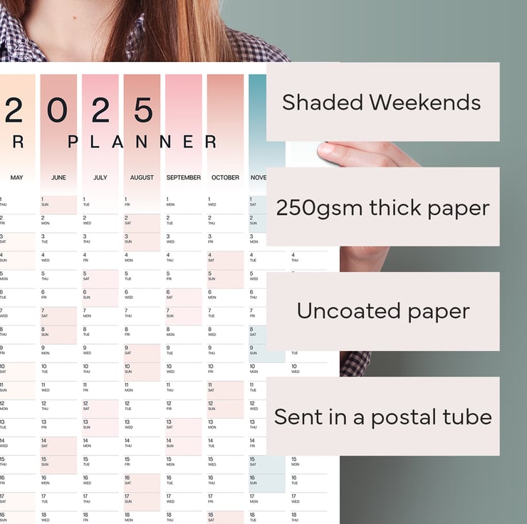 Measuring A2 size in a portrait format, this planner is printed on premium 250gsm uncoated paper, offering a sturdy, high-quality feel that’s perfect for writing on. Each planner is carefully rolled and packaged in a durable postal tube to ensure it gets to you safely.