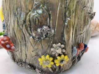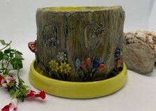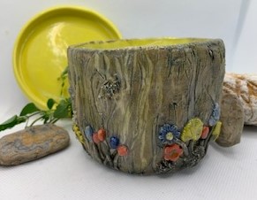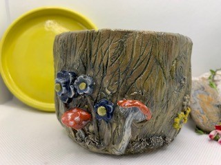 Small ceramic plant pot made with stoneware clay. Its decorated with flowers, toadstools and heavily textured. The pot is 4.5 ins (11cms) wide, 3ins (7.5cms ) tall. It has holes in the bottom so you can plant directly into the pot if you wish. Comes with a matching saucer to catch any drips!