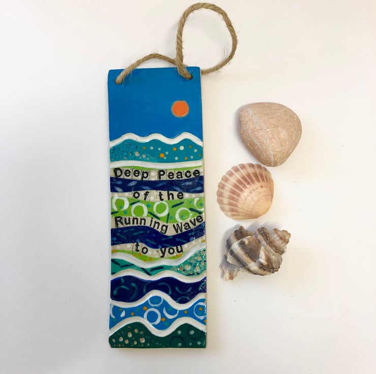 This plaque is made in stoneware ceramic and it is incised and decorated to create a landscape design in a range of ocean colours. Finished with a shiny clear glaze, it is suitable for hanging indoors or out. This plaque features a line from the Deep Peace Gaelic blessing-Deep Peace of the Running Wave to you.