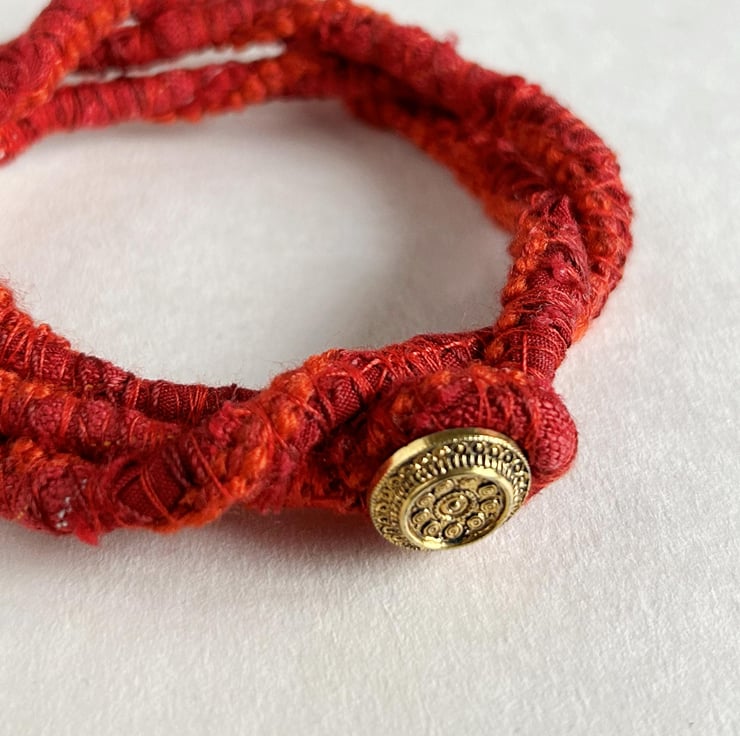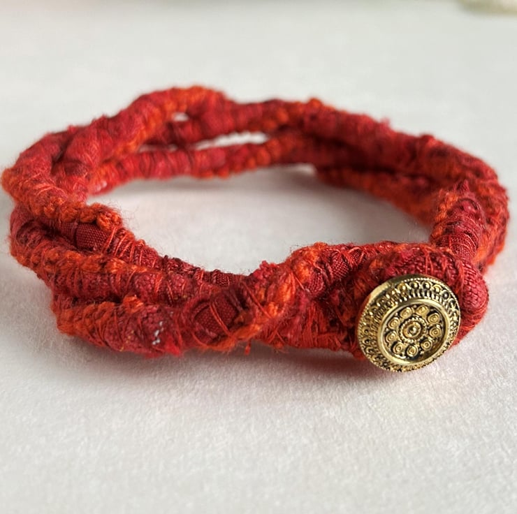 Fire red bracelet. Made out of pieces of vintage textiles, handmade string, red glittery cord and fine threads.