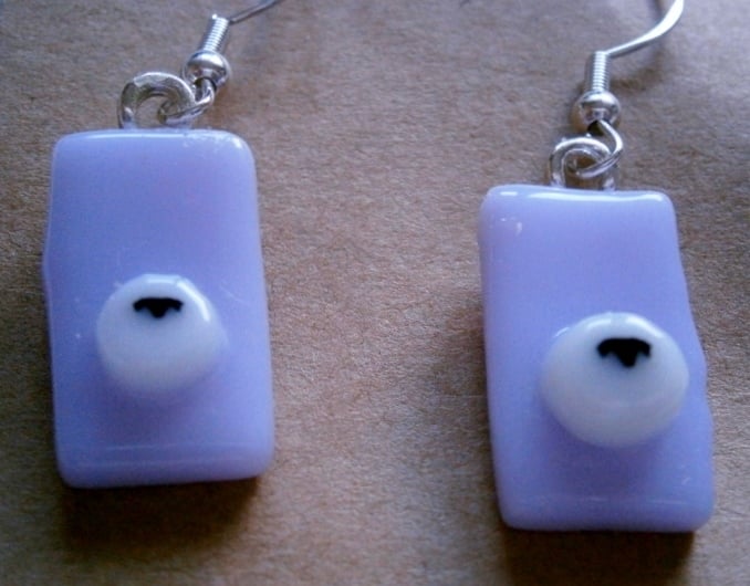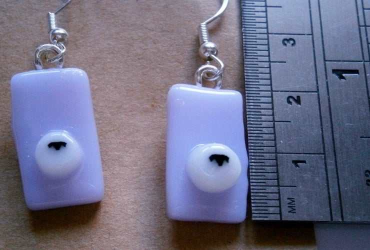 A pair of hand made fused glass Sheepy earrings in pale lilac with white sheep.