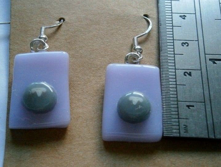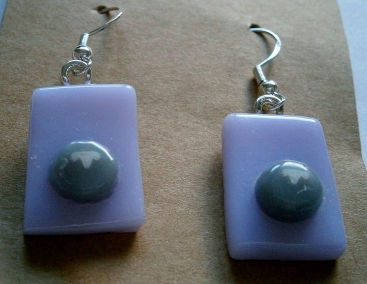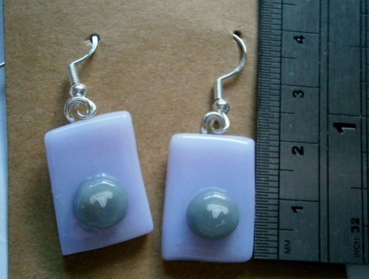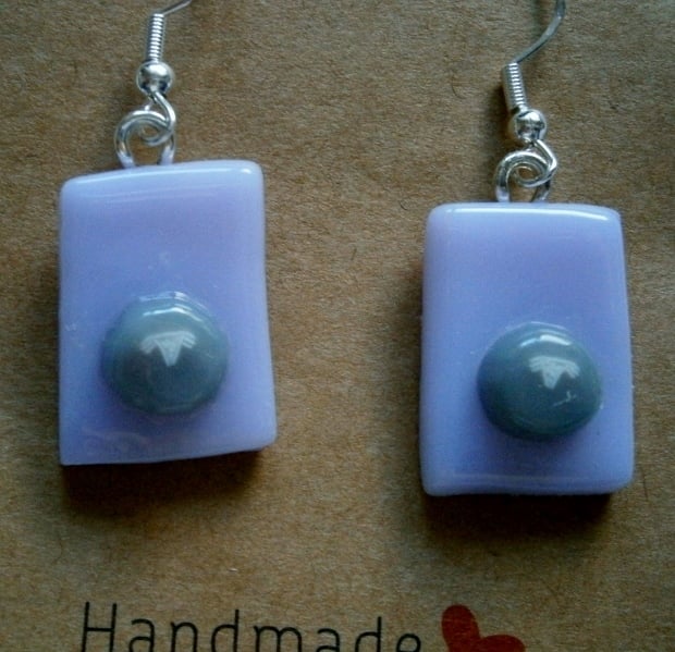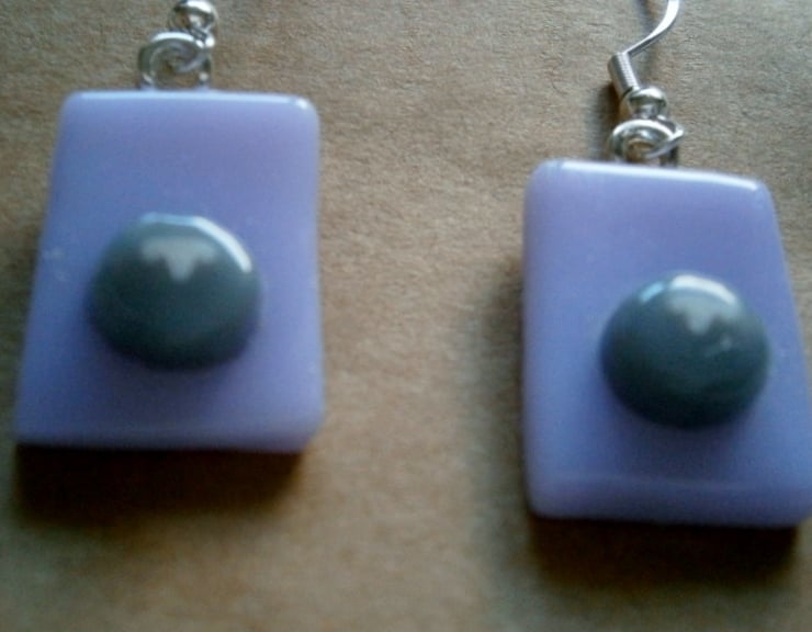A pair of hand made fused glass Sheepy earrings in pale lilac with grey sheep.