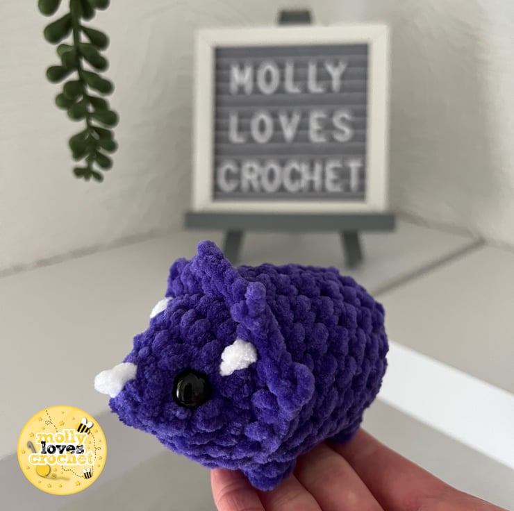 Handmade crochet mini purple triceratops made with plush yarn